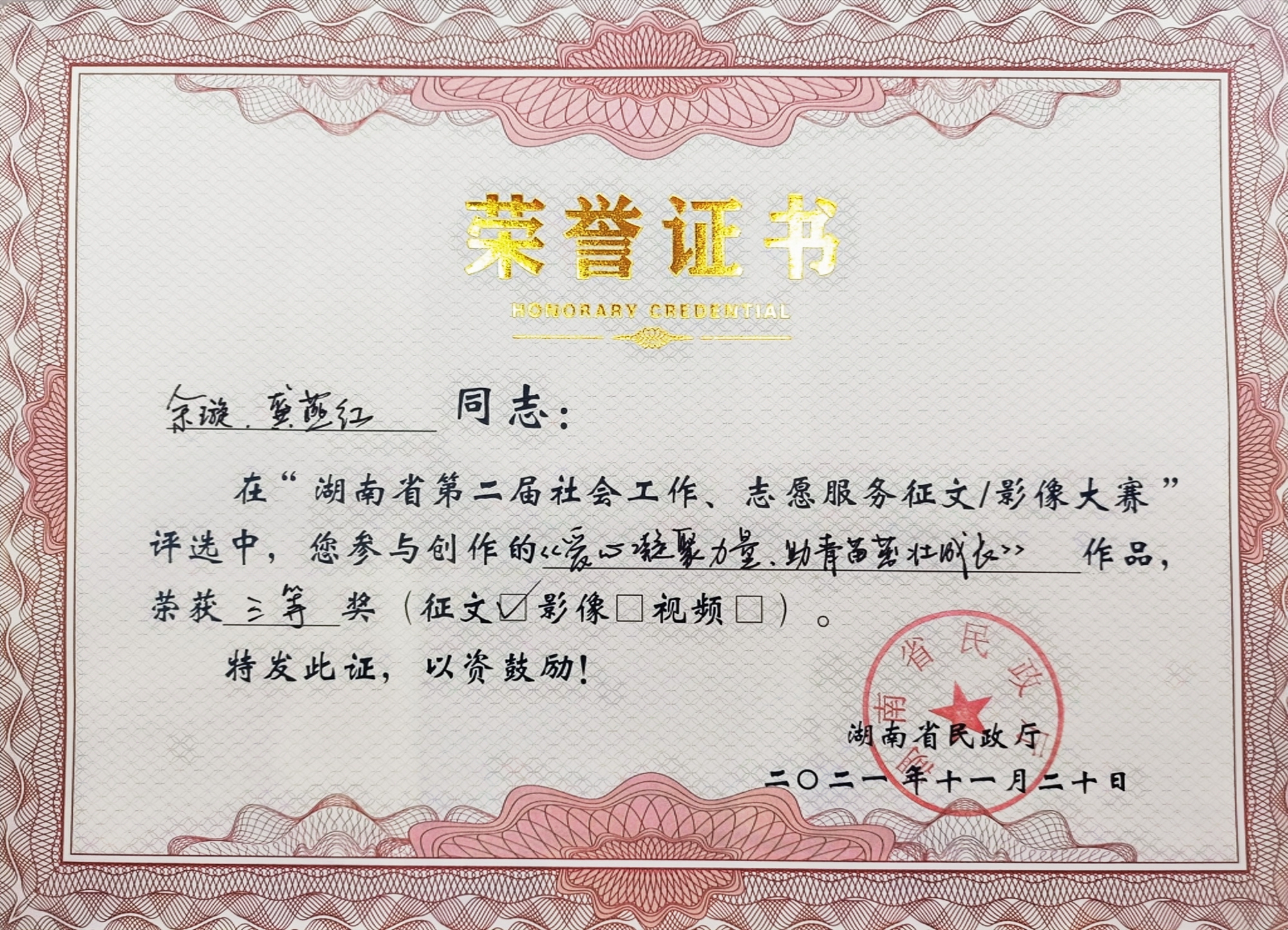 2021年,我司多名員工積極踴躍投稿參與由湖南省民政廳主辦、湖南公共頻道承辦的湖南省第二屆社會(huì)工作、志愿服務(wù)征文暨影像大賽。他們講述平凡而偉大的故事,展現(xiàn)社會(huì)工作者精神風(fēng)貌,傳播真善美,弘揚(yáng)正能量。其中兩篇原創(chuàng)征文作品、三幅原創(chuàng)影像作品在比賽中脫穎而出,榮獲一等獎(jiǎng)1個(gè)、三等獎(jiǎng)3個(gè)、優(yōu)秀獎(jiǎng)1個(gè)。